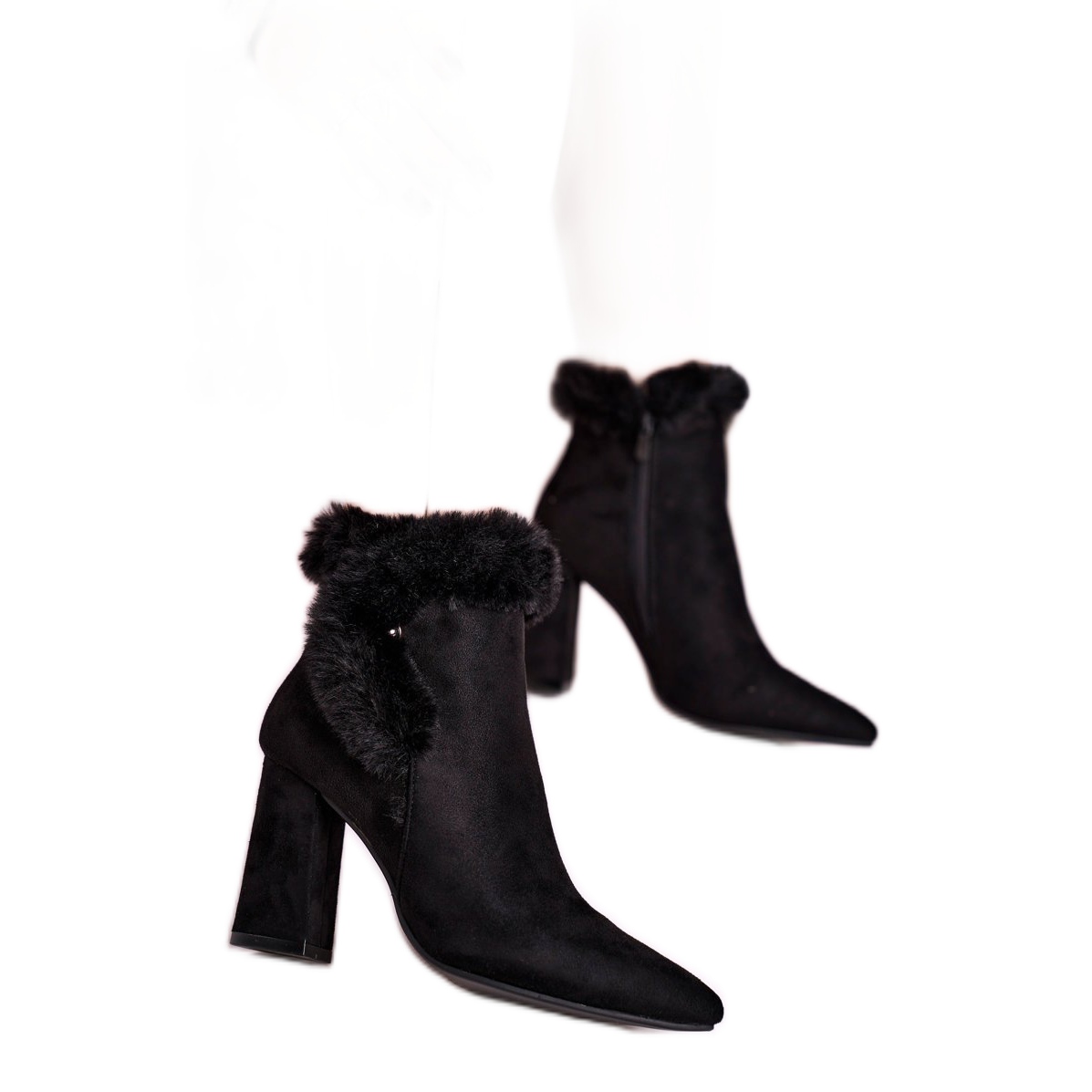 Korkea ja vakaa pylväs (9 cm) lisää vartaloon kapeaa vartaloa ja takaa käyttömukavuuden. Nilkkureissa on tyylikäs, terävä kärki, joka korostaa niiden tyylikästä luonnetta. Vetoketju helpottaa pukemista, ja niiden universaali musta väri tekee niistä helppo sovittaa eri tyyleihin - sekä arki- että tyylikkäämpiin.