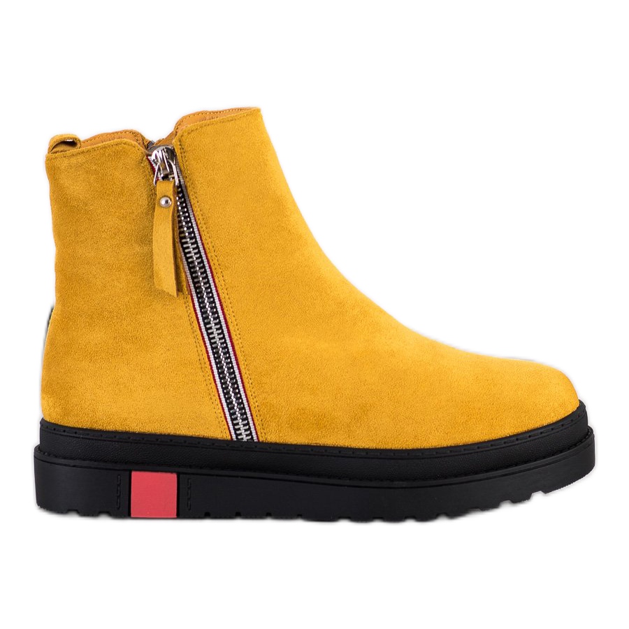 Keltaisen sävyiset Seastar-nilkkurit mustalla alustalla ovat täydellinen valinta naisille, jotka etsivät tyylikkäitä ja mukavia jalkineita syys/talvikaudelle. Valmistettu korkealaatuisesta ekologisesta mokkanahkasta, ne takaavat sekä estetiikan että käyttömukavuuden. Pyöreä kärki ja sisäänrakennettu pehmeä kantapää tekevät saappaista istuvat täydellisesti jalkaan, ja synteettinen pohja kulutuspinnalla varmistaa hyvän pidon eri pinnoilla.