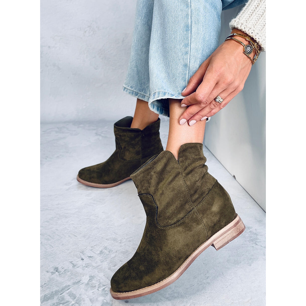 Etsitkö saappaita, jotka lisäävät muutaman senttimetrin luopumatta mukavuudesta? Vihreät hirvien vihreät saappaat piilotetulla kiilalla, jonka korkeus on 5,5 cm, on täydellinen ratkaisu viileämpiin päiviin. Valmistettu pehmeästä ekologisesta mokkanahasta, lämmittävä sisustus herkästä turkista - yhdistä tyyli ja käytännöllisyys.