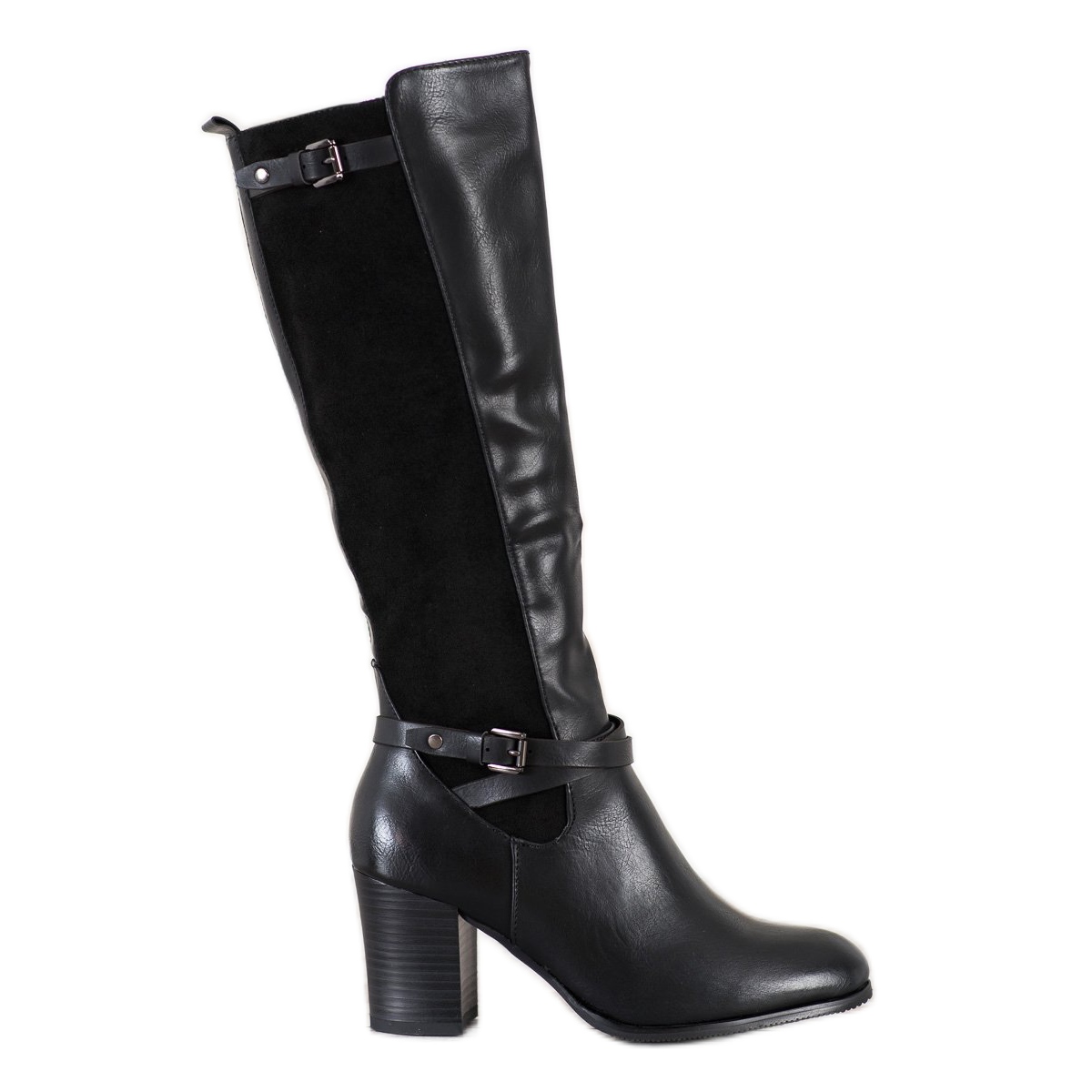 Sivusta tyylikkäällä vetoketjulla suljetut saappaat eivät ole vain esteettisiä, vaan myös käytännöllisiä. Ainutlaatuisena korostuksena on kauluksessa oleva mokkanahka ja ohut vyö, jonka ranteeseen on punottu koristeellinen solki, joka lisää tyylikästä luonnetta. Korkea, 7,5 cm korkea lohkokorko korostaa täydellisesti figuuria, ja sileä synteettisestä materiaalista valmistettu pohja varmistaa vakauden ja mukavuuden kävellessä.