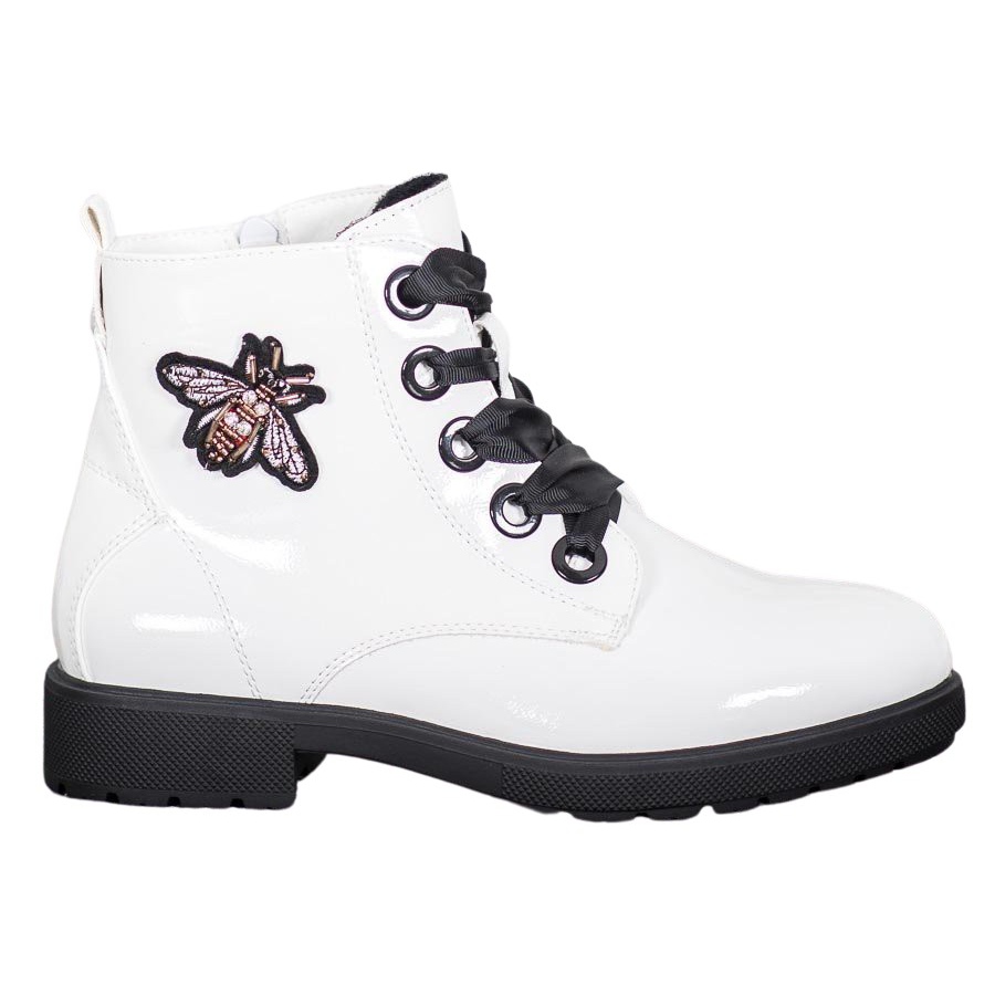 Päällisen takaosaan sijoitetut mustat nauhat luovat silmiinpistävän kontrastin kevyen viimeistelyn kanssa, ja painava, 3 cm korkea synteettinen pohja takaa vakauden ja mukavuuden. Näiden saappaiden erottava lisäelementti on ainutlaatuinen hyönteisen muotoinen sovellus, joka on sijoitettu sivulle nilkan yläpuolelle, mikä antaa niille ainutlaatuisen ilmeen.