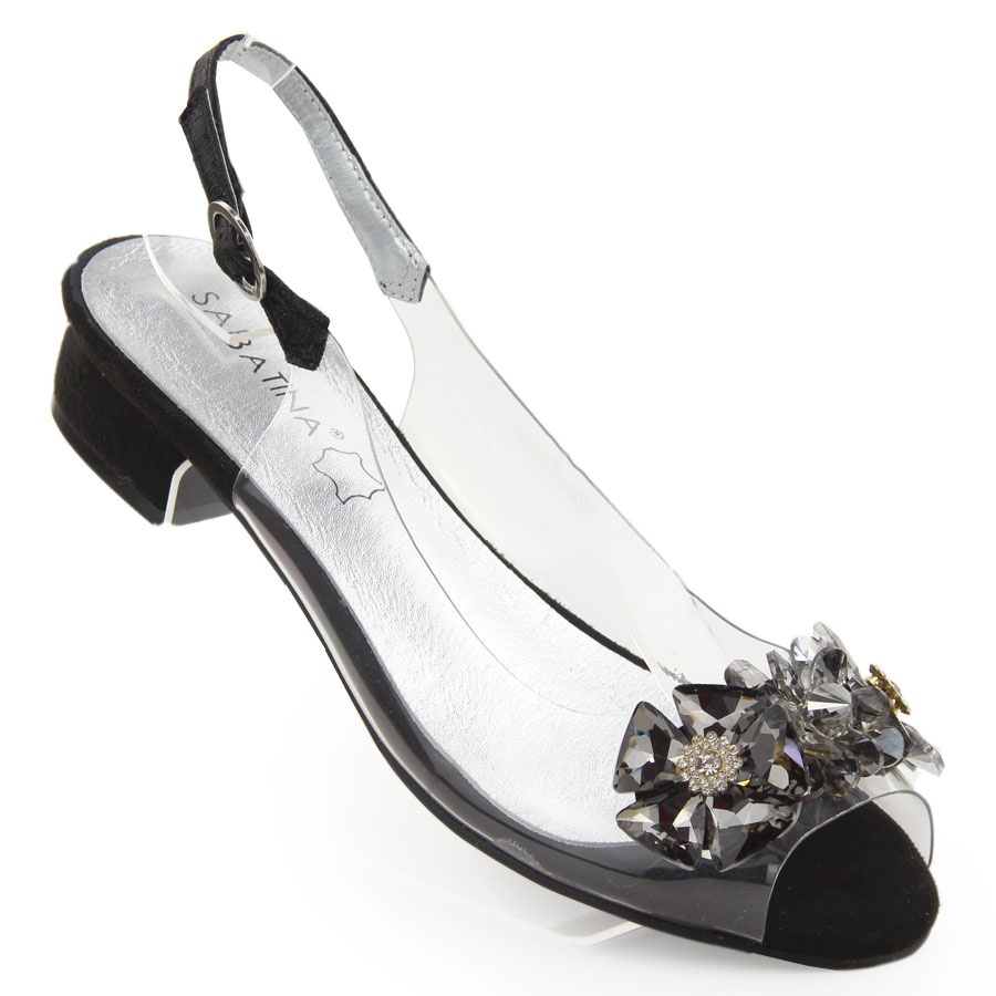 Löydä uusi eleganssin ulottuvuus läpinäkyvällä litteällä sandaaleilla, joissa on mustia kiviä tunnetusta Sabatina -tuotemerkistä. Nämä erittäin tyylikkäät sandaalit yhdistävät tyylin ja mukavuuden, mikä tekee niistä täydellisen valinnan kesäpäiviin.