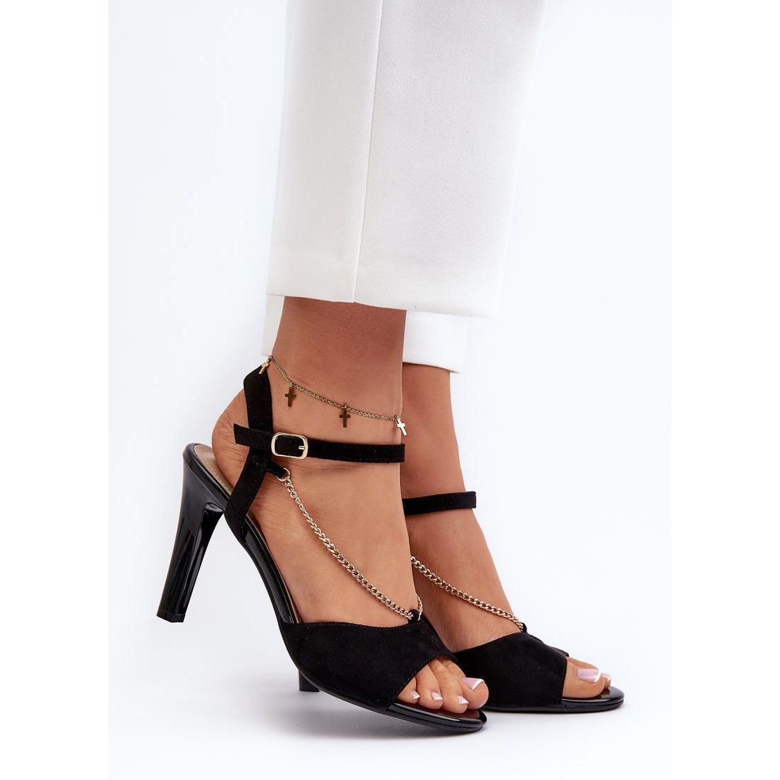 Nämä sandaalit ilahduttavat paitsi estetiikan, myös toiminnallisuuden kanssa. Säädettävän hihnan ansiosta voit helposti sovittaa ne jalkaasi, mikä varmistaa mukavuuden jopa pitkän aikavälin kuluessa. Korkea kantapää nastan muodossa, 9,5 cm korkealla, lisää eleganssia ja korostaa hahmoa, ja hienovarainen koristeketju antaa heille ainutlaatuisen luonteen.