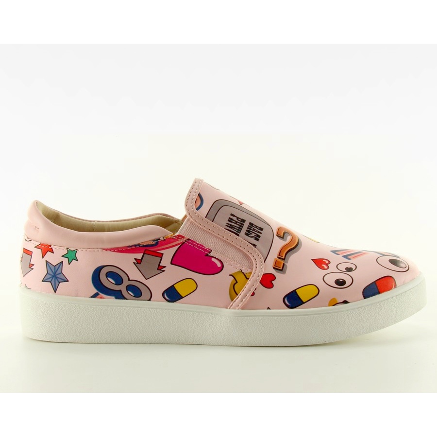 Comic Slipons 6120 Pink - raikas, energinen aksentti jokapäiväiseen muotoiluun. Vaaleanpunaiset lippalakit, joissa on värikäs sarjakuvakuvio, herättävät huomion ja lisäävät luonnetta sekä urheilulliseen että rentoon lookiin. Valmistettu täysjyväisestä eko-nahasta, tekstiilisisus ja luonnonnahkainen sisäosa - kevyt ja mukava malli jokaiseen päivään.