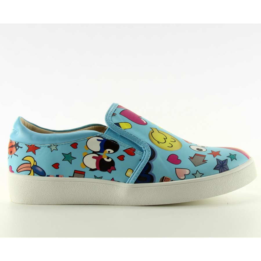 Comic Slipons 6120 Blue - tyylikkäät slip-on lenkkarit intensiivisen sinisessä versiossa. Sarjakuvan inspiroima energinen, värikäs kuvio herättää huomion, ja sileäsyinen ekonahka antaa niille modernin luonteen. Täydellinen rentoon ja urheilulliseen tyyliin - mukava, kevyt ja erittäin naisellinen.