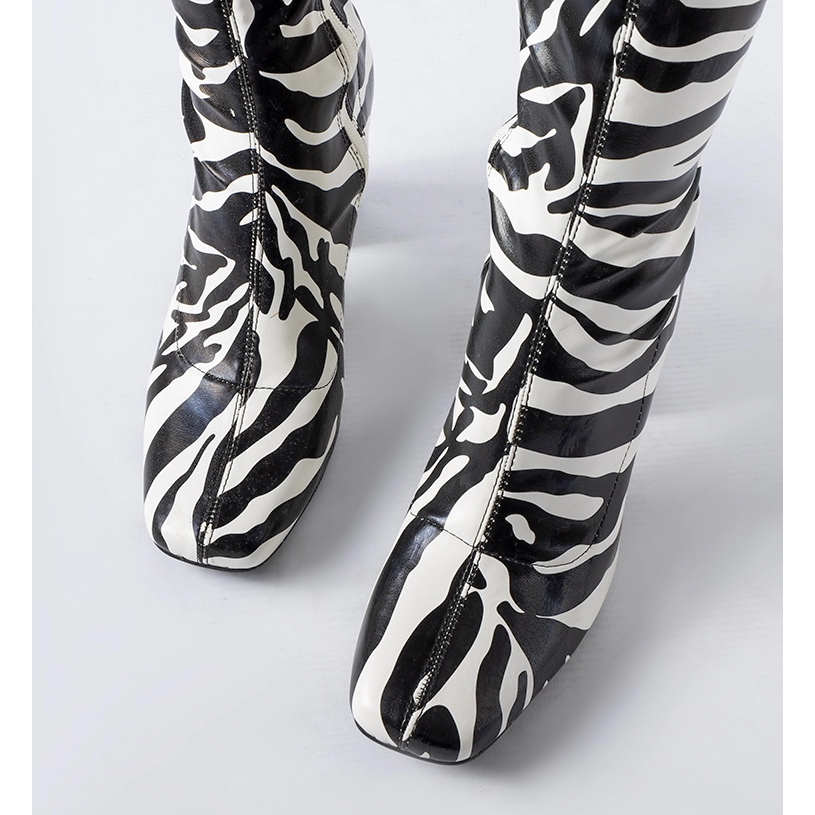 Tyylikkäät ylämaan saappaat muodikkaalla kuviolla, joka jäljittelee seepra -ihoa. He saavuttavat nilkan, on käytännöllinen lukko, joka helpottaa laitosta ja vakaa posti, jonka korkeus on 8,5 cm. Täydellinen syksy -talvikausi ihmisille, jotka arvostavat rohkean suunnittelun yhdistelmää mukavuudella.