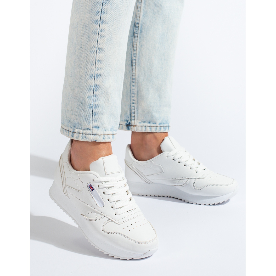 Valkoinen, joka hallitsee sekä päällismateriaalia että pohjaa, lisää kenkiin universaalisuutta ja raikkautta. Tällaiset kengät sopivat helposti moniin tyyleihin ja sopivat täydellisesti kevät- ja kesäkauteen. Valmistuksessa käytetyt materiaalit ovat keinonahkaa ja tekstiilisisustus, mikä todistaa valmistajan yksityiskohtien huomioimisesta ja ympäristövastuusta.