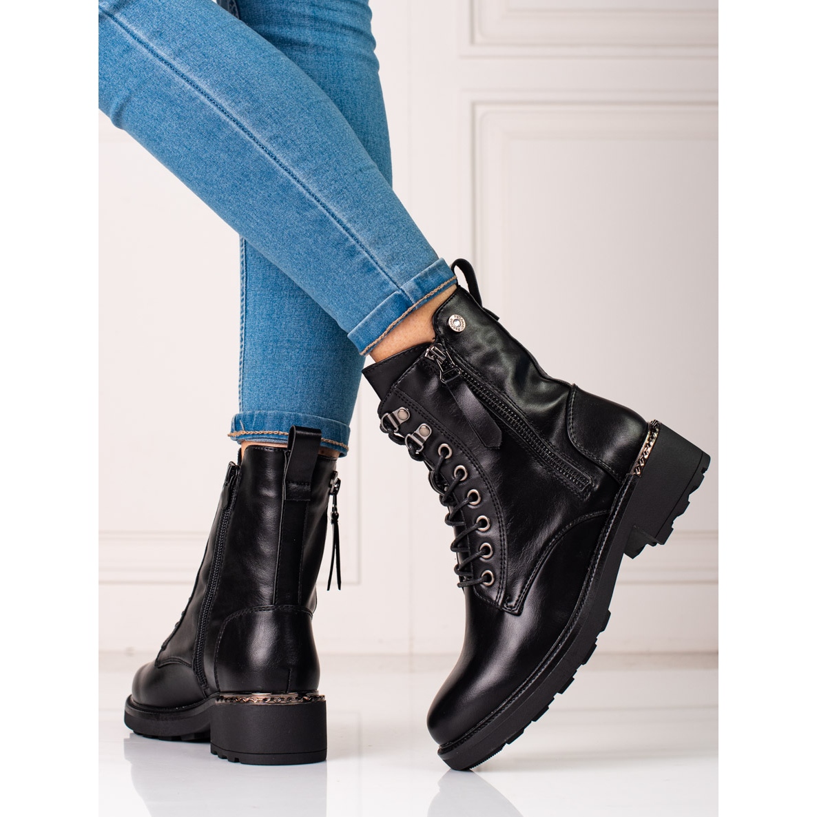 Löydä syksyn/talvikauden uusin jalkinetrendi Shelovetin naisten nauhakengissä, joissa on klassinen musta väri. Nämä tyylikkäät nilkkurit on valmistettu korkealaatuisesta ekologisesta nahasta, mikä tekee niistä paitsi muodikkaan aksentin, myös ympäristöystävällisen valinnan. Sisäänrakennetun, jäykistetyn kantapään ansiosta jalkasi tuntuvat mukavalta ja vakaalta.