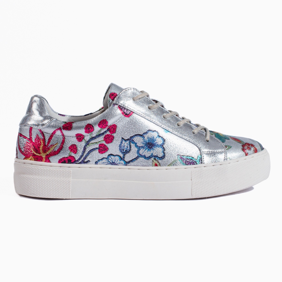 Näiden kenkien ilmiö piilee tarkasti valitussa korkealaatuisen synteettisen päällysmateriaalin yhdistelmässä, jossa on kangasvuori. Hopeaa kiiltävää sävyä on rikastettu monivärisellä kukkakuviolla, joka lisää raikkautta ja tyttömäistä charmia kenkiin. Jalkineille on ominaista pyöreä kärki, joka takaa mukavuuden kävellessä, ja rakennettu, pehmeä kantapää stabiloi ja suojaa jalkaasi.