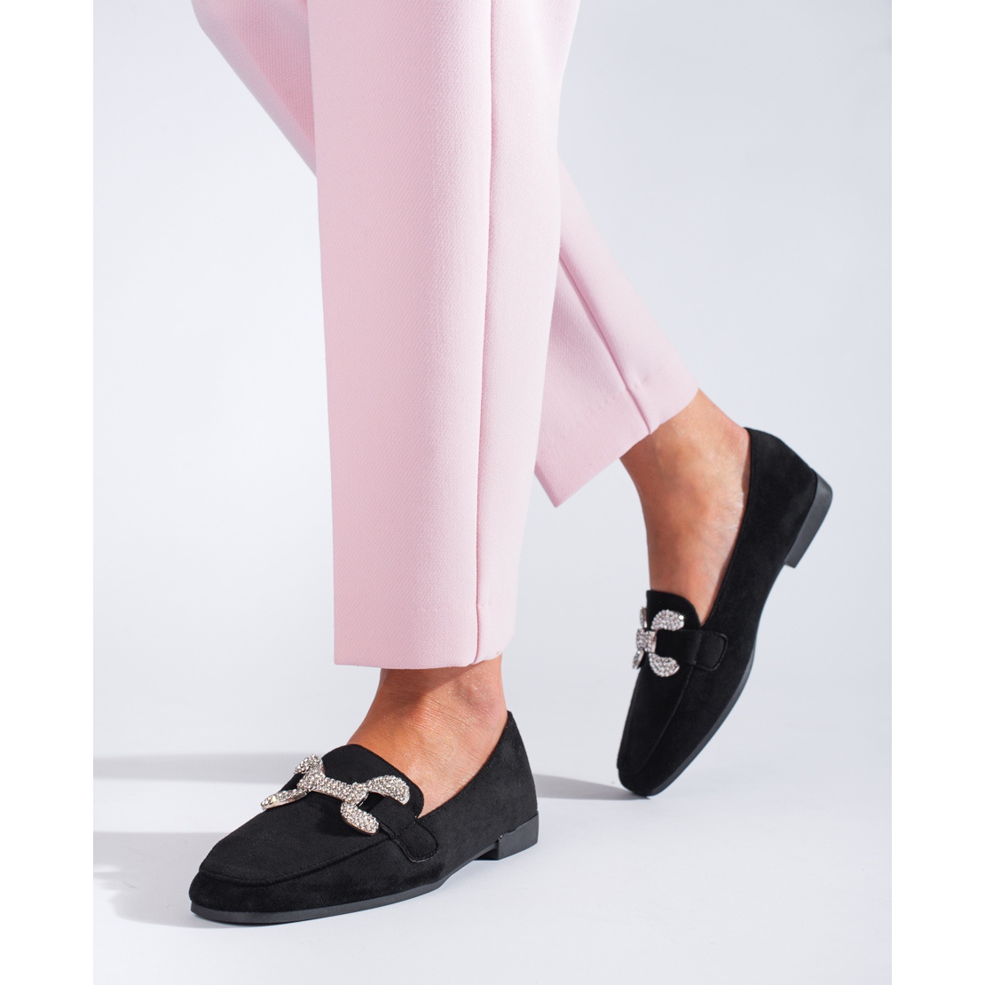 Mokassiinien sisällä on ekologinen nahkainen sisäosa, joka lisää käyttömukavuutta. Klassinen musta väri tekee niistä äärimmäisen universaaleja - ne sopivat moniin eri tyyleihin, ja lisäkoristeet zirkonien ja strassien muodossa antavat niille ainutlaatuisen luonteen.