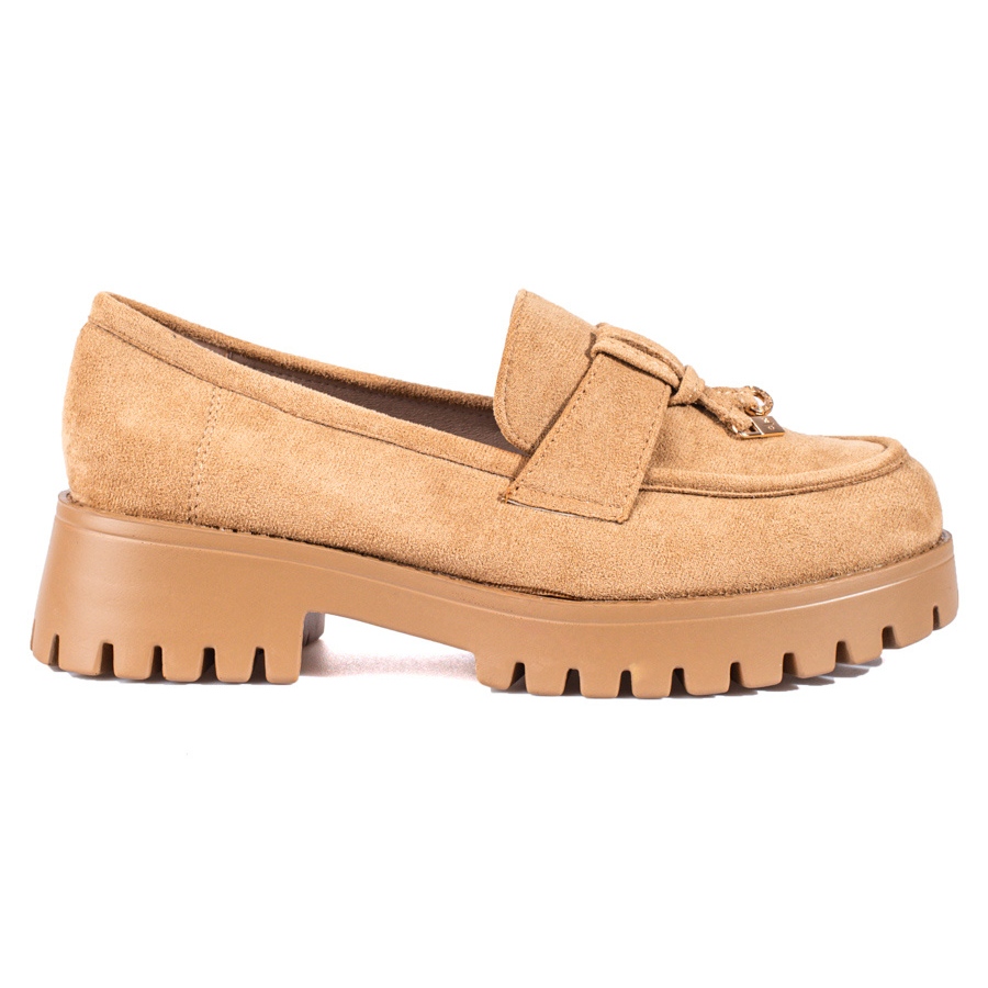 Laadukkaista materiaaleista valmistettujen loaferien ulkoosa on valmistettu mokkanahasta, mikä antaa niille ainutlaatuisen luonteen. Pehmeä, sisäänrakennettu kantapäätaskuri varmistaa käyttömukavuuden, ja pyöreä kärki lisää hienovaraisuutta. Paksu synteettinen pohja kulutuspinnalla takaa hyvän pidon ja vakauden, ja lisäksi 2,5 cm korkea alusta tekee jokapäiväisestä käytöstä nautintoa.