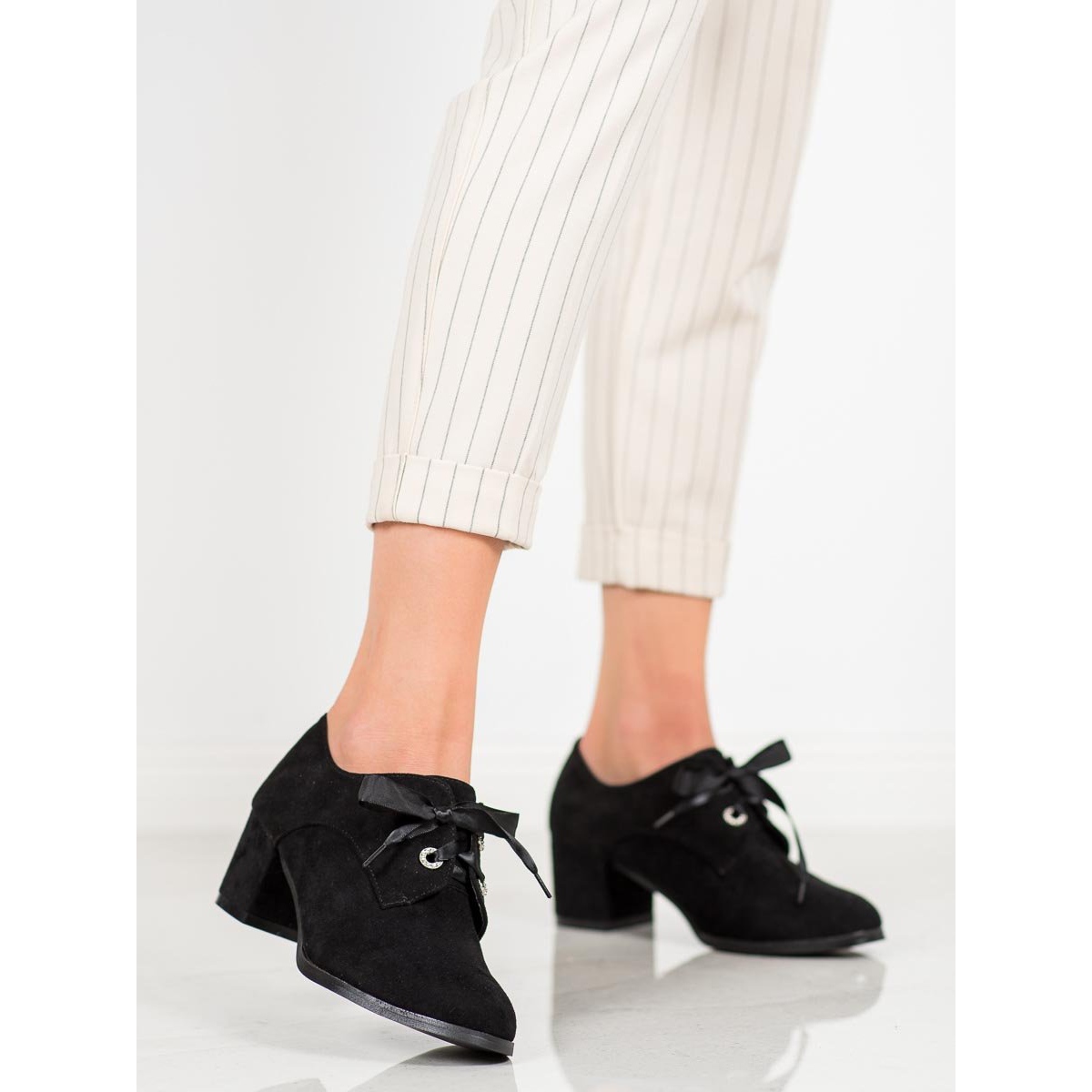 Tutustu eleganssin klassikkoon modernissa versiossa - mustat nauhalliset korkokengät valmistajalta SHELOVET. Nämä kauniit naisten kengät on valmistettu huolellisesti ympäristöystävällisestä mokkanahkasta, joten ne ovat ihanteellinen valinta niille, jotka pitävät vegaanisista tuotteista. Niiden klassinen, pyöreä kärki ja pehmeä, sisäänrakennettu kantapää takaavat käyttömukavuuden koko päivän.