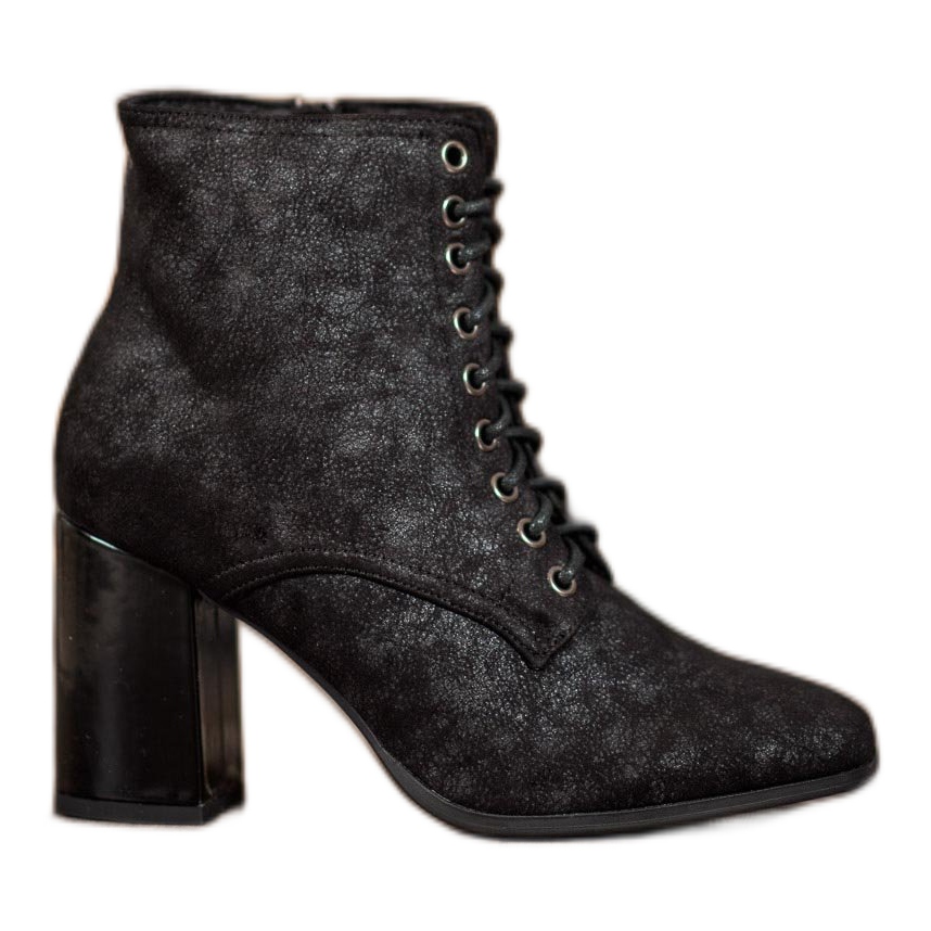 Saappaissa on vakaa 8,5 cm lohkokorko, joka varmistaa mukavuuden koko päivän käytössä. Nilkkapituiset päälliset on koristeltu käytännöllisillä nauhoilla edestä ja lisäksi varustettu sisäpuolella vetoketjulla, mikä helpottaa pukemista.