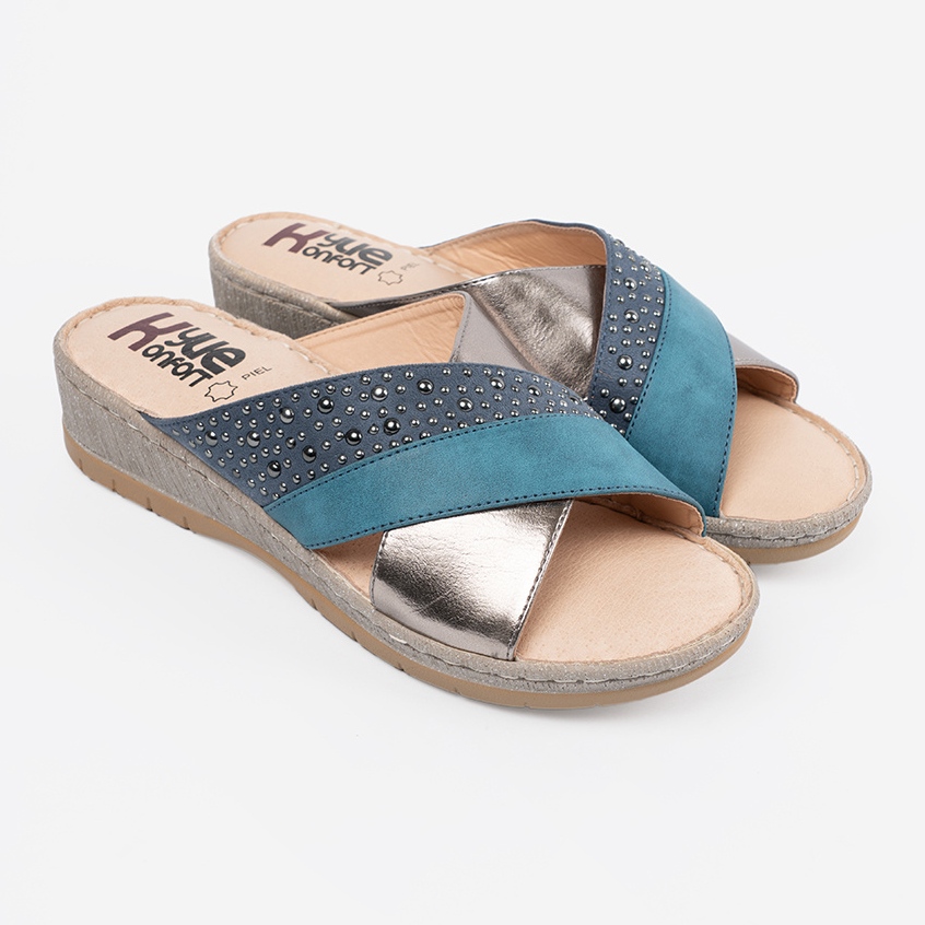 Valmistettu korkealaatuisesta iho -imitaciónista, sekä ylä- että sisäosasta, takaa paitsi muodikkaan ulkonäön, myös mukavuuden koko päivän. Avoin kantapää ja nenän puute ovat yksityiskohtia, jotka lisäävät keveyttä ja hengittävyyttä, ja hopea -nastat antavat läpät modernin hahmon.