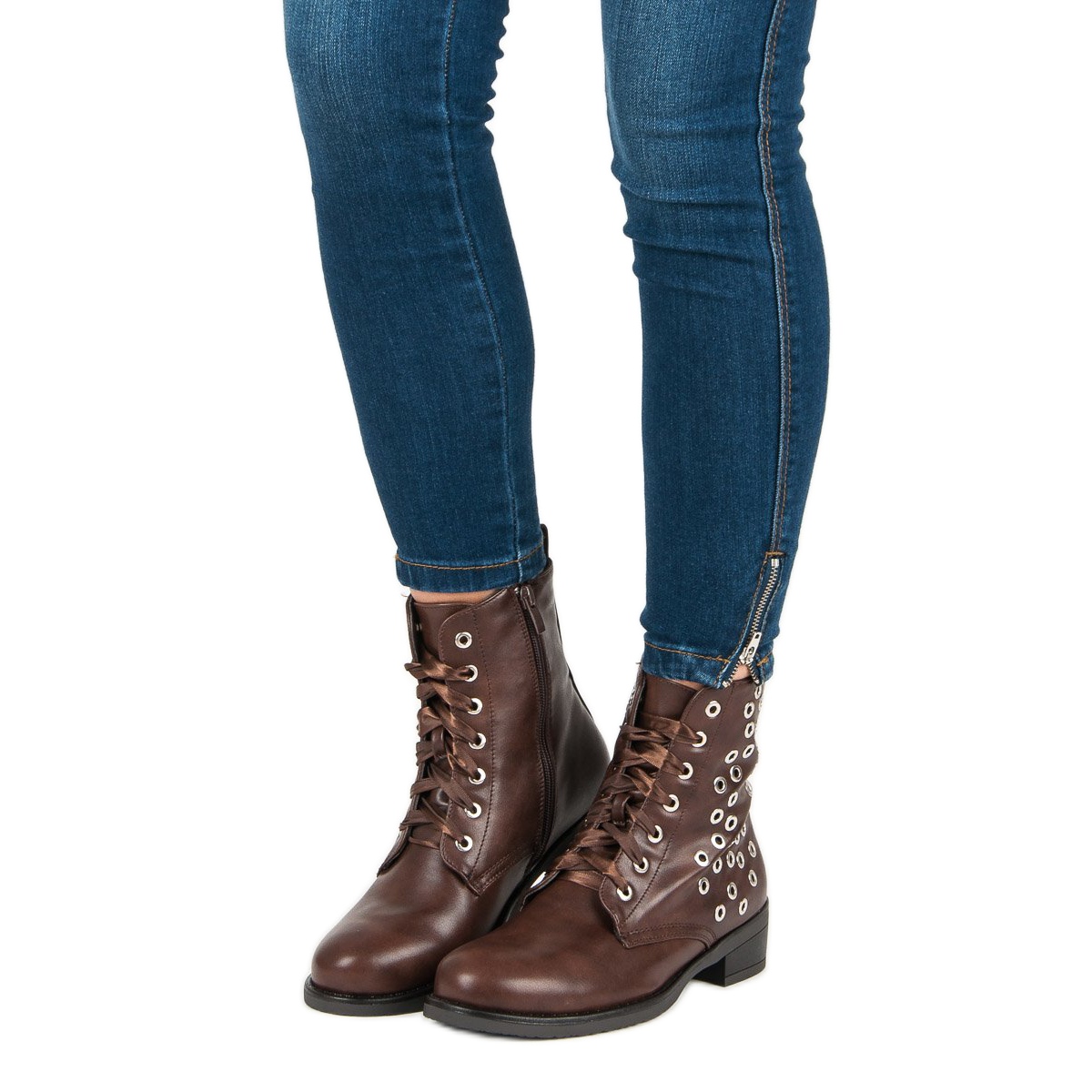 Ruskeat työntekijöiden saappaat on varustettu vahvoilla, ruskeilla nauhoilla ja houkuttelevalla sivuvetoketjulla, jotka eivät ainoastaan korosta niiden modernia luonnetta, vaan helpottavat niiden pukemista. Lisäkoristeet strassien muodossa antavat niille rock-tunnelmaa, joka sopii täydellisesti rentoon tyyliin.
