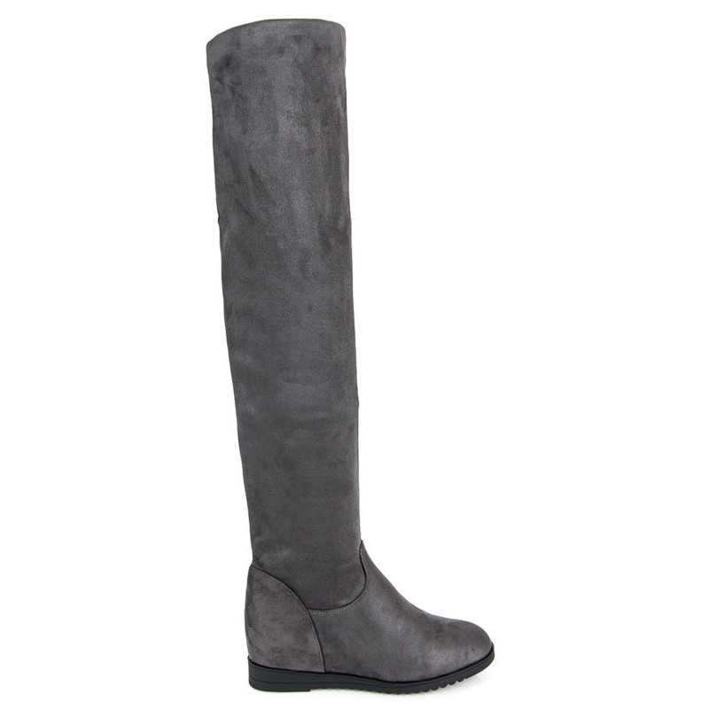 Slip-on-mallin ansiosta ne on helppo pukea ja riisua, mikä tekee näistä saappaista erittäin mukavia käyttää joka päivä. Polven yläpuolelle ulottuva korkea päällinen korostaa jalkoja ja lisää houkuttelevuutta mihin tahansa tyyliin. Lisäksi 8 cm korkea kiila takaa vakauden ja siluetin optisen laajennuksen.