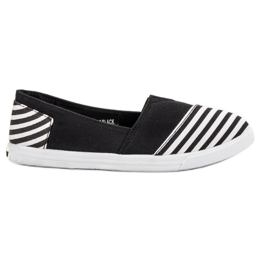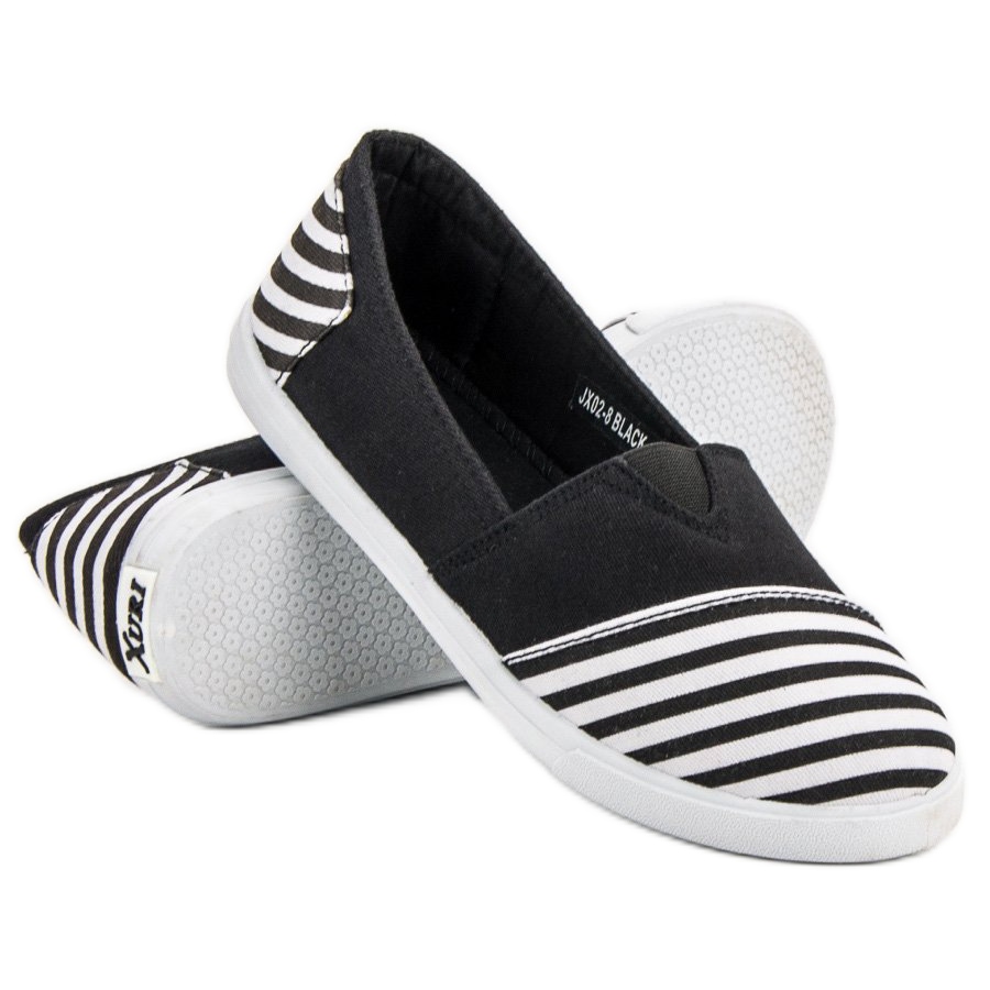 Niiden ominainen muotoilu erottuu mielenkiintoisesta yhtenäisen mustan yhdistelmästä mustien ja valkoisten raitojen kanssa, jotka sijaitsevat varpaassa ja kantapään ympärillä, mikä tekee niistä muodikkaita ja omaperäisiä. Slip-on-kiinnitys varmistaa helpon ja nopean pukemisen ja riisumisen, ja pehmeä kantapää takaa mukavuuden käytön aikana.