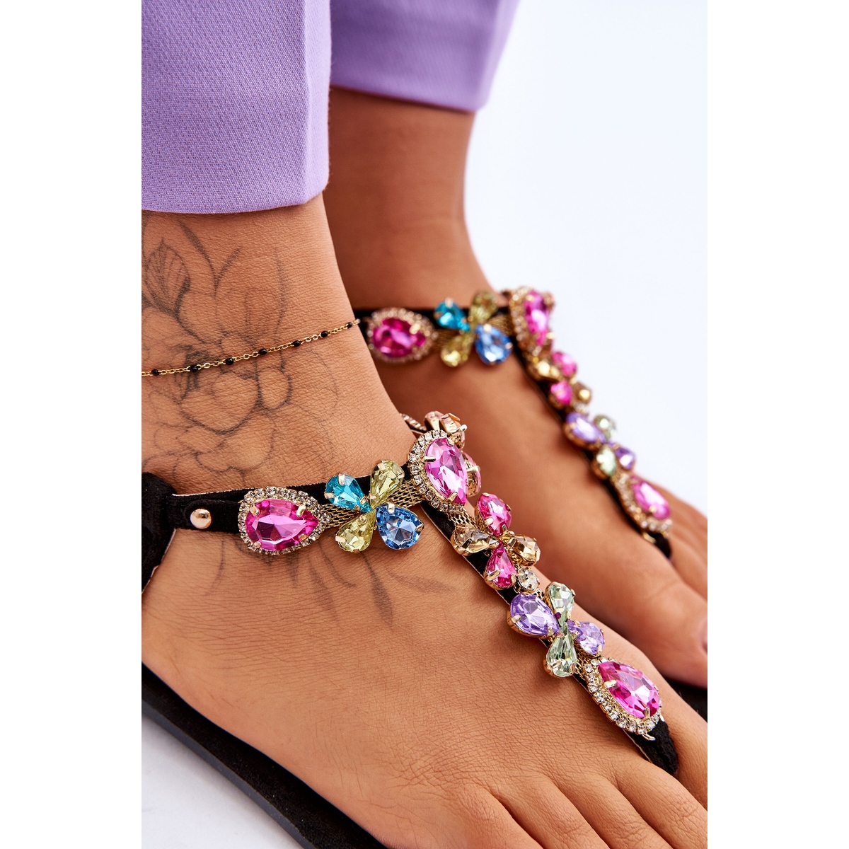 Sandaalit on valmistettu korkealaatuisesta ekologisesta mokkanahkasta, mikä tekee niistä miellyttävät koskettaa ja ovat ympäristöystävällisiä. Musta, ajaton viimeistely tekee niistä täydellisen täydennyksen lähes kaikkiin kesätyyliin, ja lisäksi monivärinen kivi- ja strassisuunnittelu antaa niille ainutlaatuisen, ylellisen luonteen.