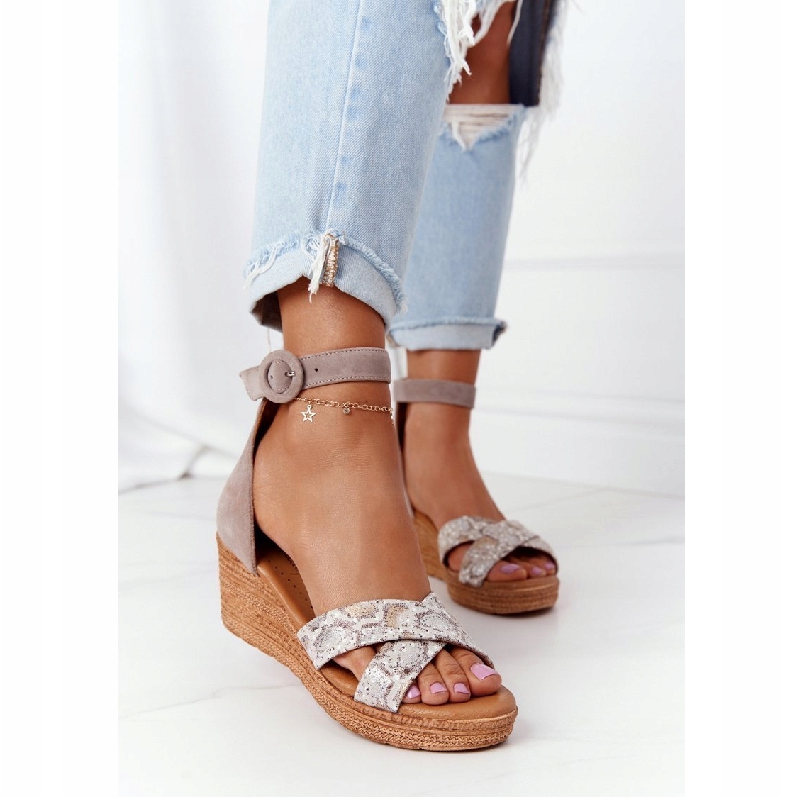 Yksityiskohdat: Suede Wedge Sandaalit Maciejka 04565-04 Beige-Gold