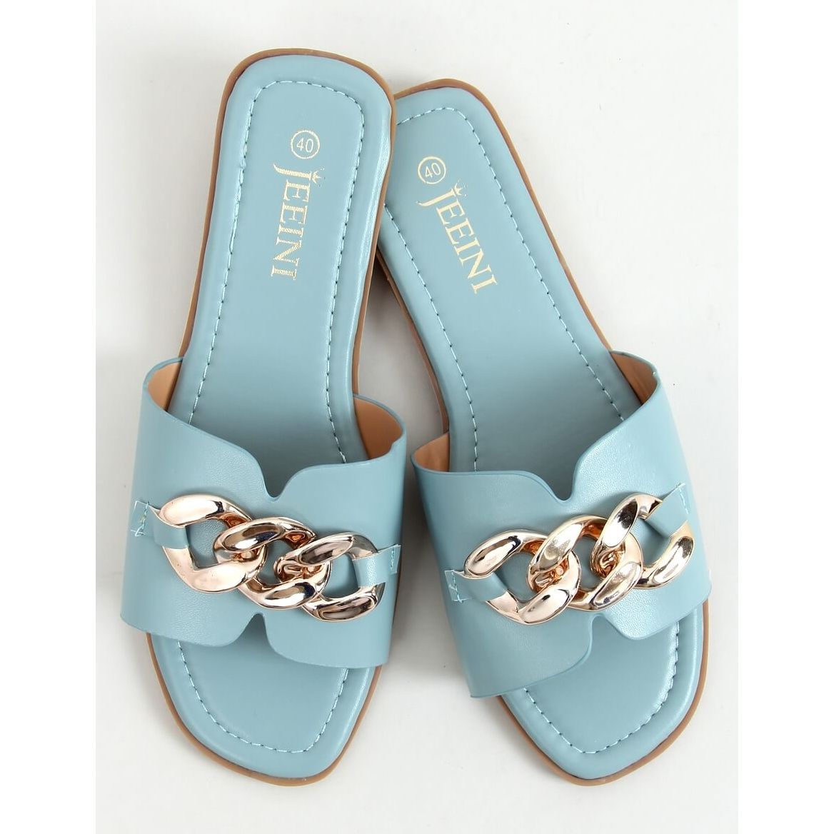 Nämä varvastossut on valmistettu korkealaatuisesta ekologisesta nahasta, ja niissä yhdistyvät mukavuus ja eleganssi. Sinisen sävyt ja kullanväriset ketjuaksentit tekevät niistä täydellisesti yhteen kesämekkojen ja rento tyylien kanssa. Beige pohja lisää hienovaraisuutta, ja tasainen kantapää tekee siitä mukavan käyttää koko päivän.