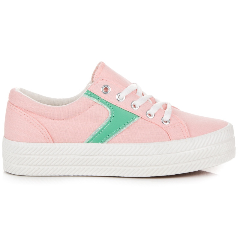 Tennarien yläosa on valmistettu korkealaatuisesta tekstiilimateriaalista, mikä varmistaa hengittävyyden ja käyttömukavuuden. Vaaleanpunaisen värin viehätyksen rikkoo herkkä vihreä aksentti, mikä antaa kokonaisuudelle muodikkaan luonteen. Tennareissa on klassinen nauhakiinnitys ja pyöreä kärki, joka korostaa niiden urheilullista tyyliä ja sopii täydellisesti jokapäiväiseen käyttöön.