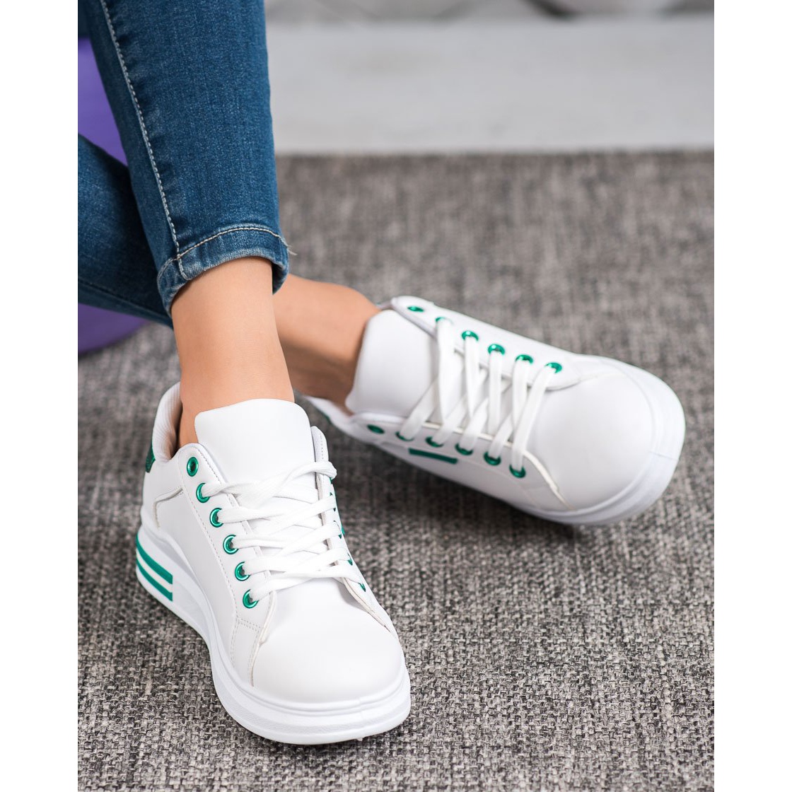 Valkoiset SHELOVET Platform Tennarit vihreällä korostuksella on täydellinen valinta jokaiselle modernille naiselle, joka arvostaa tyylin ja mukavuuden yhdistelmää. Urheilullisen mutta muodikkaan muotoilunsa ansiosta nämä lenkkarit sopivat täydellisesti sekä arkeen että arkisempiin tyyleihin.