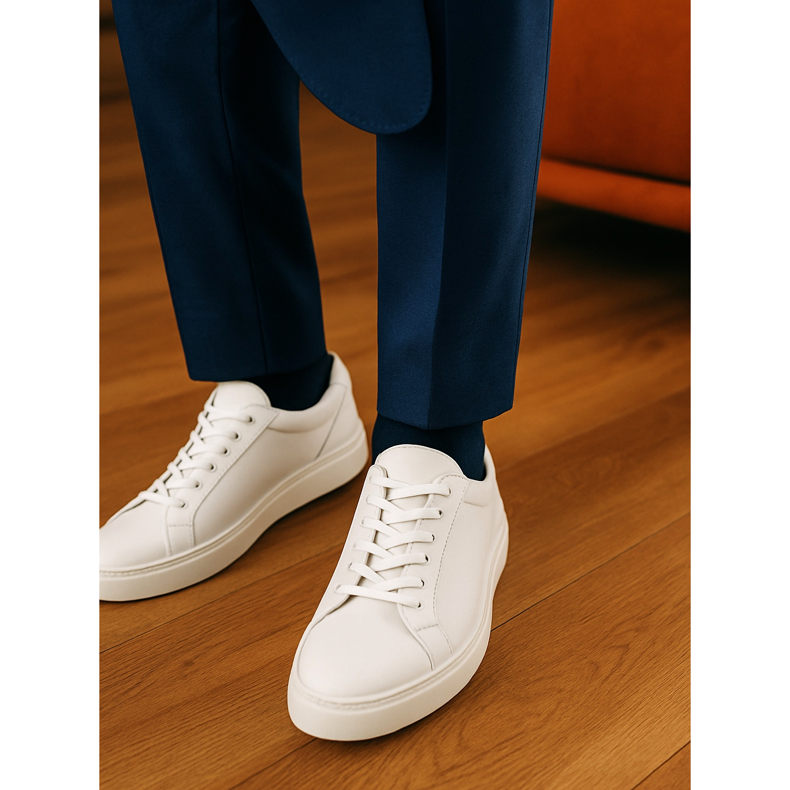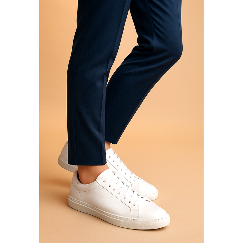 Kaikki lenkkarit eivät sovi puvun kanssa. Unohda isot lenkkitossut tai kuluneet lenkkarit kuntosalilta. Valitse tyylikkäisiin housuihin minimalistisia malleja, joissa on ohut siluetti (niin sanottu matala profiili). Turvallisin valinta on valkoiset, nahkaiset tennarit ilman tarpeettomia logoja ja värikkäitä lisäyksiä. Puhdas valkoinen lisää raikkautta ja sopii täydellisesti laivastonsinisen, harmaan ja beigen kanssa.