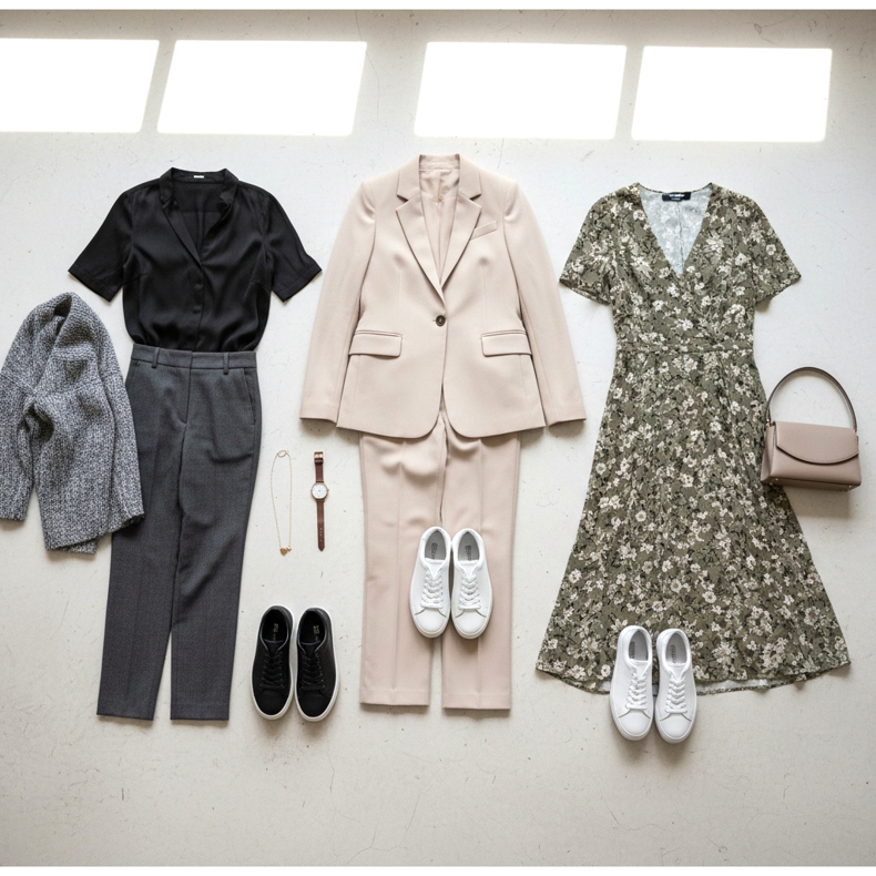 Tyylikkäät tupakkahousut yhdistettynä istuvaan puseroon ja mustaan lenkkariin ovat klassinen ja turvallinen toimistotyyli. Lisää takki tai neuletakki ja olet valmis mihin tahansa tapaamiseen. Ilmava midi-mekko hillityssä värissä sopii täydellisesti valkoisten tennarien kanssa - tämä setti on täydellinen vähemmän muodollisiin päiviin toimistossa tai luovalla työpaikalla.