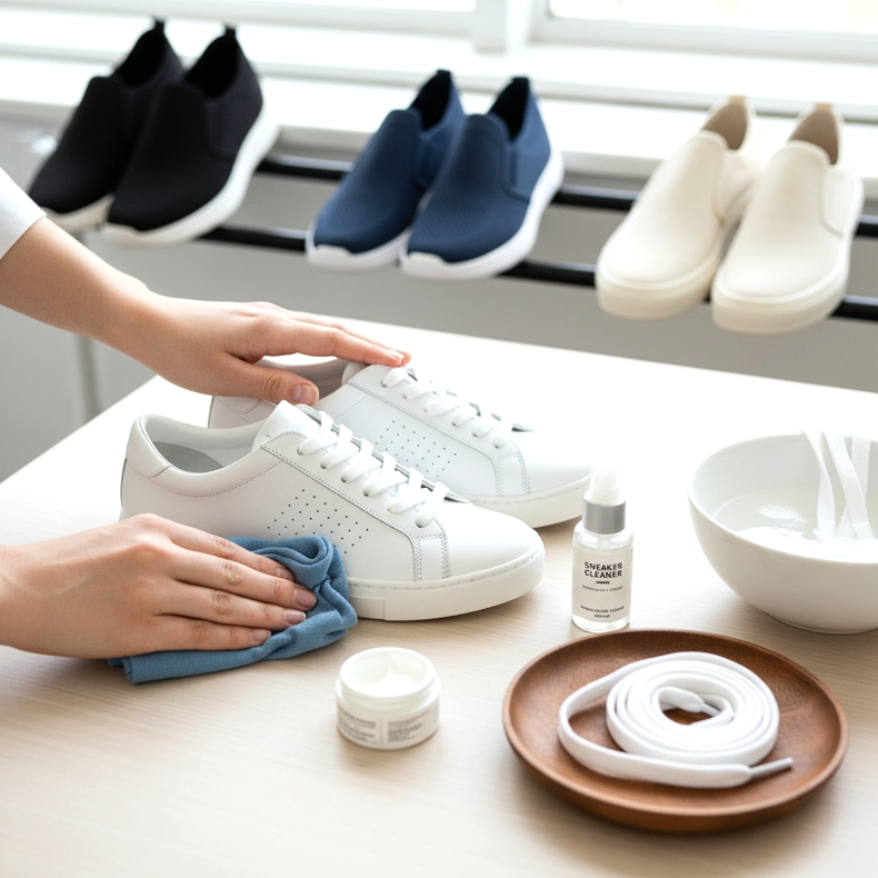 Joka päivä töissä käytettävät tennarit vaativat säännöllistä hoitoa. Valkoiset mallit menettävät tuoreen ilmeensä erityisen nopeasti, joten kannattaa tietää muutama temppu. Tärkeintä on säännöllinen puhdistus - pyyhi kengät kostealla liinalla jokaisen käyttökerran jälkeen. Hellävarainen kenkävoide tai erityinen puhdistusaine auttaa tehokkaasti poistamaan lian nahasta.