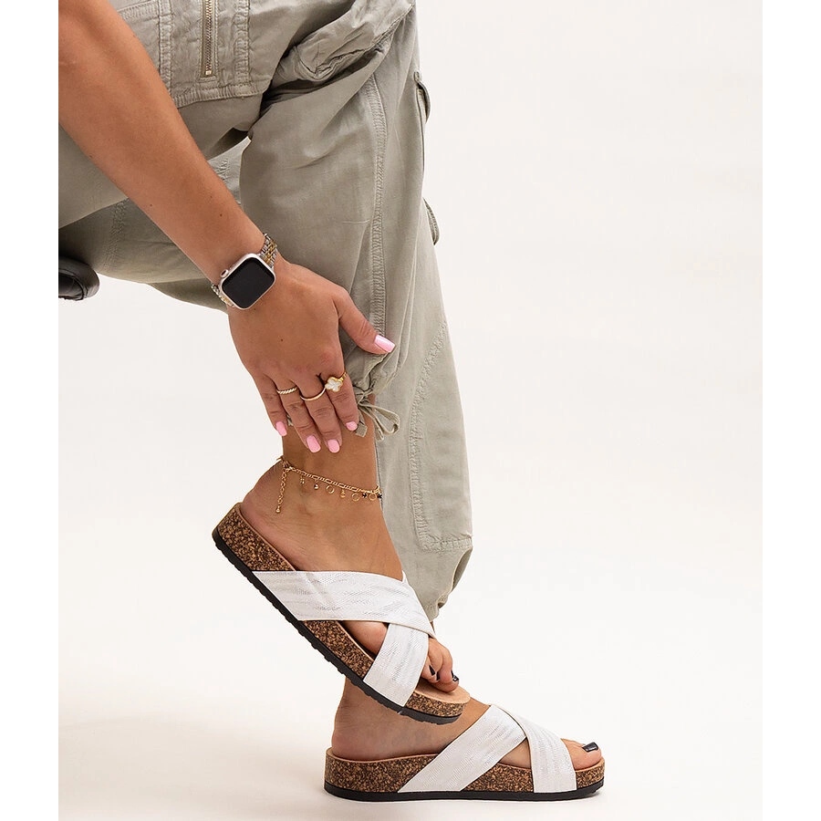 Löydä epätavalliset kapsit korkkipohjasta, jossa on kiilto valkoisella - täydellinen kuumille kesäpäiville! Nämä tyylikkäät liukumiskengät, joissa on pyöreä nenä, ovat yhdistelmä tyylikkyyttä ja mukavuutta, jota arvostat arjen toiminnan aikana. Valmistettu korkealaatuisesta kumista, ne varmistavat kestävyyden ja mukavuuden käytön, ja heidän suunnittelijan ulkonäkö saa sinut silmään jokaisessa vaiheessa.