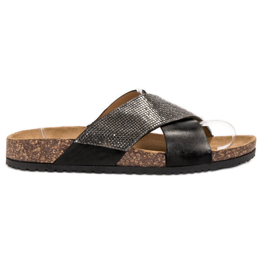Yksityiskohtia kunnioittaen tehdyt varvastossut erottuvat koristeellisista strasseista ja strasseista, jotka antavat niille alkuperäisen ilmeen. Musta viimeistely tekee niistä erittäin universaaleja ja sopii täydellisesti kaikkiin asuihin. Ilman varvaslaatikkoa ja avoimella kantapäällä ne tarjoavat erinomaisen ilmanvaihdon ja käyttömukavuuden, täydelliset lämpimiin kevät- ja kesäpäiviin.