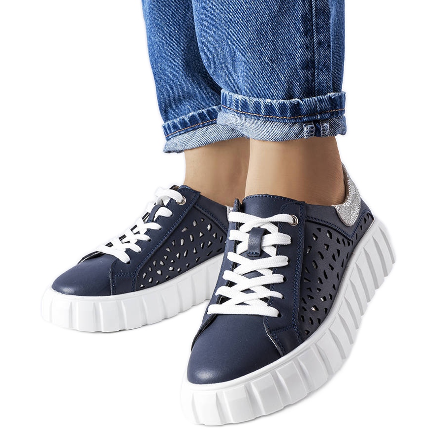 Tyylikäs yhdistelmä kaupunkien puhdistumaa ja klassikoita - kiiltävästä, avoimesta nahkasta valmistettujen merivoimien siniset lenkkarit, jotka ovat sopivia värin täyttöä ja sinisiä laastari -inserttejä. Aseta selkeä, valkoinen pohja pystysuorilla urilla, pyöreällä nenällä ja nauhoittamalla täydellistä istuvuutta.