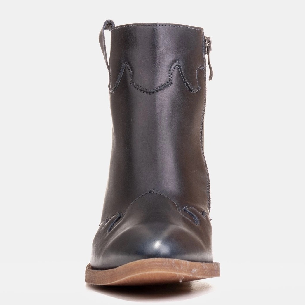 Tyylikkät naisten saappaat muodikkaassa, syvässä sinisessä sävyssä. Valmistettu vilja -nahasta, joka on suunniteltu klassisiksi nilkan cowboy -saappaiksi - tyylikäs lisäys jokapäiväisiin ja tyylikkäimpiin tyyliin.