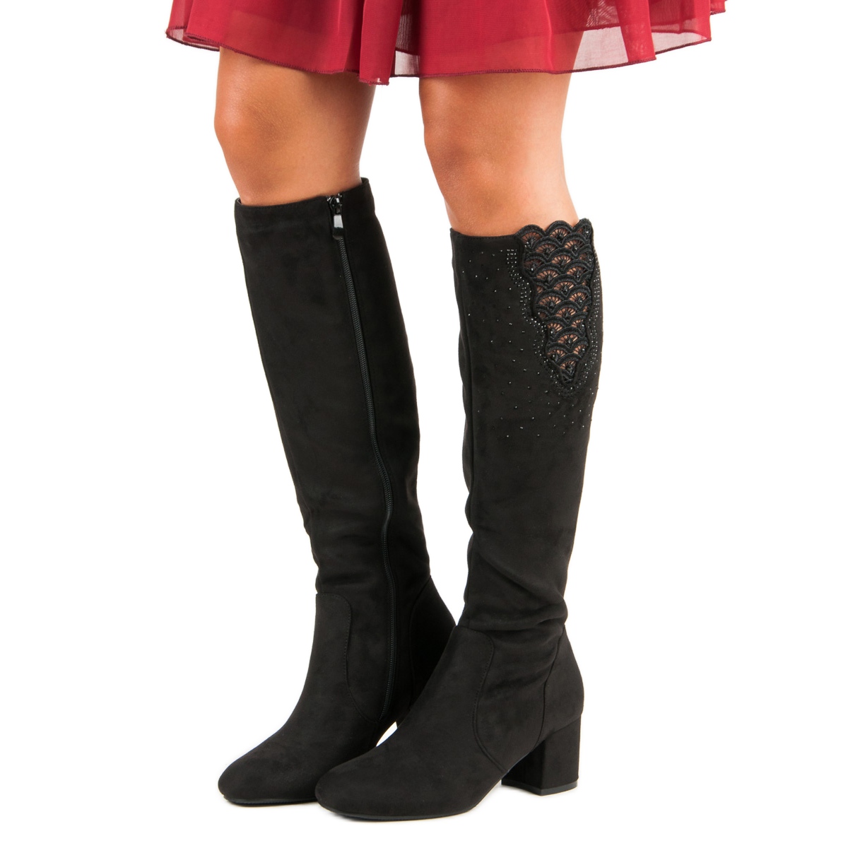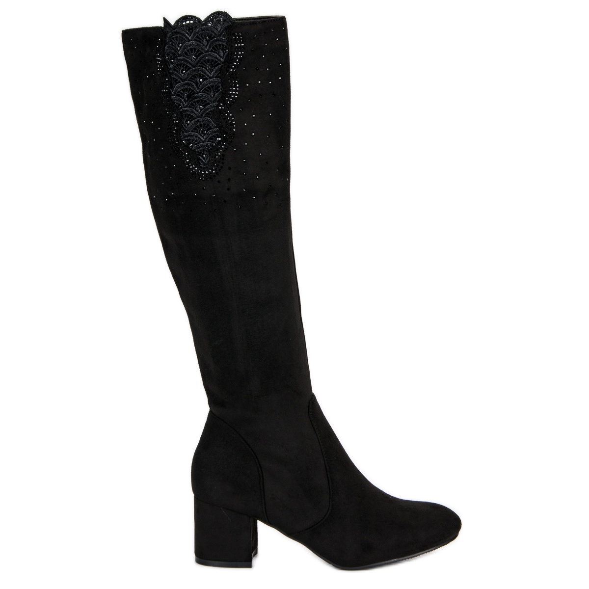 Mustat saappaat on tunnusomaista kauniisti koristeltu päällys, joka herättää huomion hienovarainen pitsi yläosassa, jota täydentävät herkät kristallit. Tämä yksityiskohta antaa niille ainutlaatuisen viehätyksen ja hienostuneisuuden, mikä tekee niistä ihanteellisen valinnan erityistilaisuuksiin naisille, jotka arvostavat hyvää makua ja muodikas tyyliä.