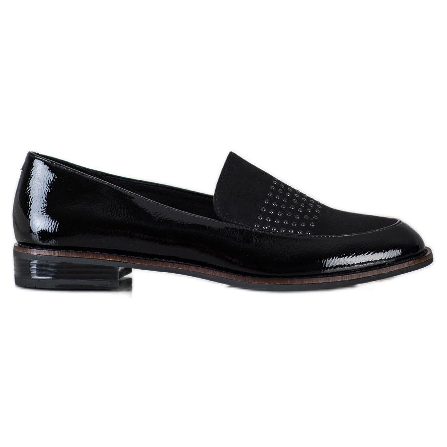 Näiden kenkien päällinen on yhdistelmä keinonahkaa ja mokkanahkaa, mikä tekee niistä paitsi tyylikkäitä myös kestäviä. Pyöreät varpaat on koristeltu hienovaraisella koristelulla pienten pisteiden muodossa, mikä lisää kokonaisuuteen ainutlaatuista luonnetta. Klassiset mustat värit tekevät näistä kengistä yhteensopivia moniin tyyleihin, sekä arkisoihin että elegantempiin.