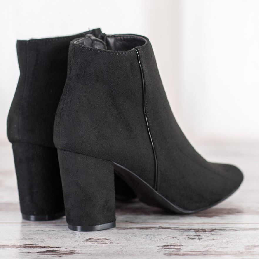 Löydä eleganssia ja tyyliä Goodinin mustat teräväkärkiset nilkkurit. Nämä klassiset kengät, jotka on valmistettu ekologisesta mokkanahkasta, ovat täydellinen valinta jokaiselle naiselle, joka haluaa lisätä tyylikkyyttään. 8 cm korkea lohkokorko pidentää täydellisesti jalkoja korostaen naisellista siluettia, ja pyöreä kärki sekä sisäänrakennettu, jäykistetty kantapää takaavat poikkeuksellisen käyttömukavuuden.
