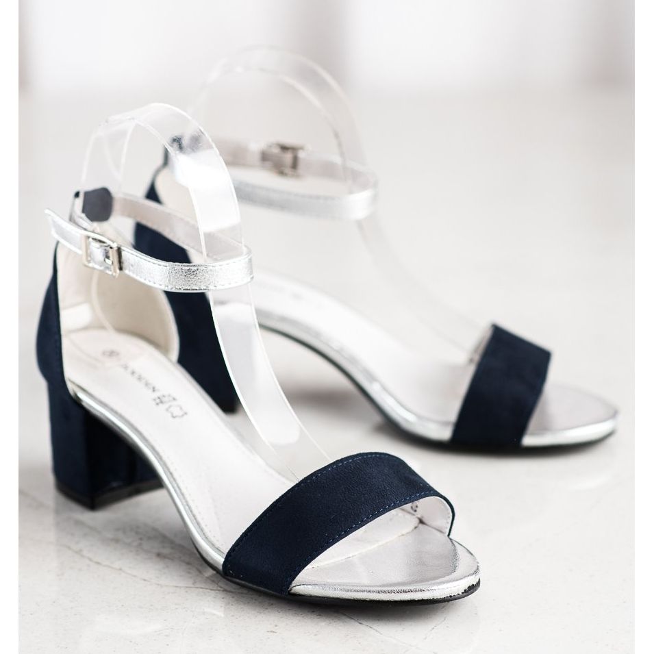 Laadukkaista materiaaleista valmistetuissa sandaaleissa on tummansininen keinonahka ja mokkanahkapäällinen, mikä antaa niille modernin ja tyylikkään ilmeen. Kengän yläosassa oleva hopeinen raita korostaa hienovaraisesti koko ilmettä ja lisää hieman kiiltoa. Avokorko ja yksinkertainen solki varmistavat kenkien pukemisen ja riisumisen mukavasti, mikä on erittäin käytännöllistä intensiivisemmillä hetkillä.