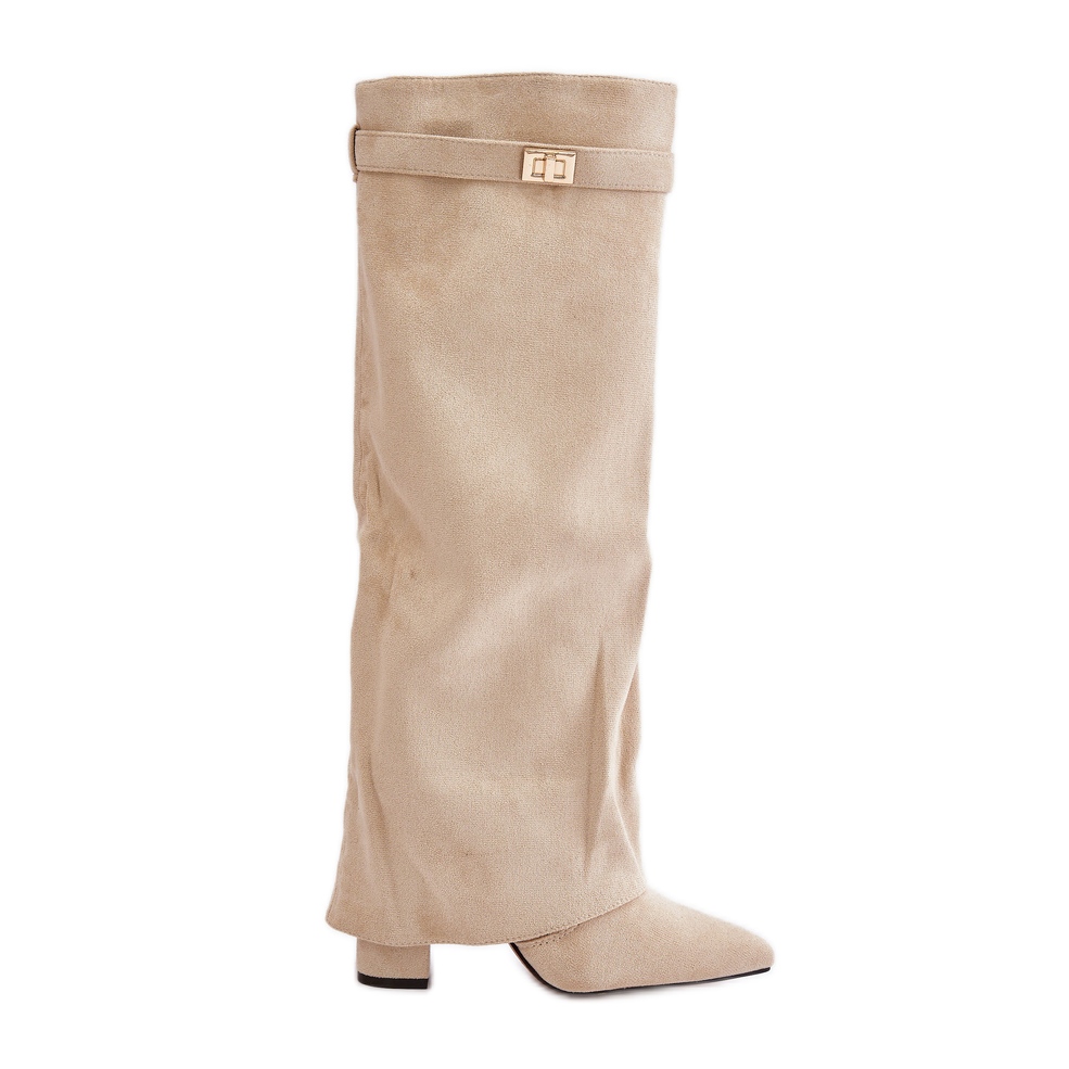 Yksityiskohdat: Urellin vaalean beige-eristetyt korkeakorkoiset saappaat käännetyllä ylhäällä