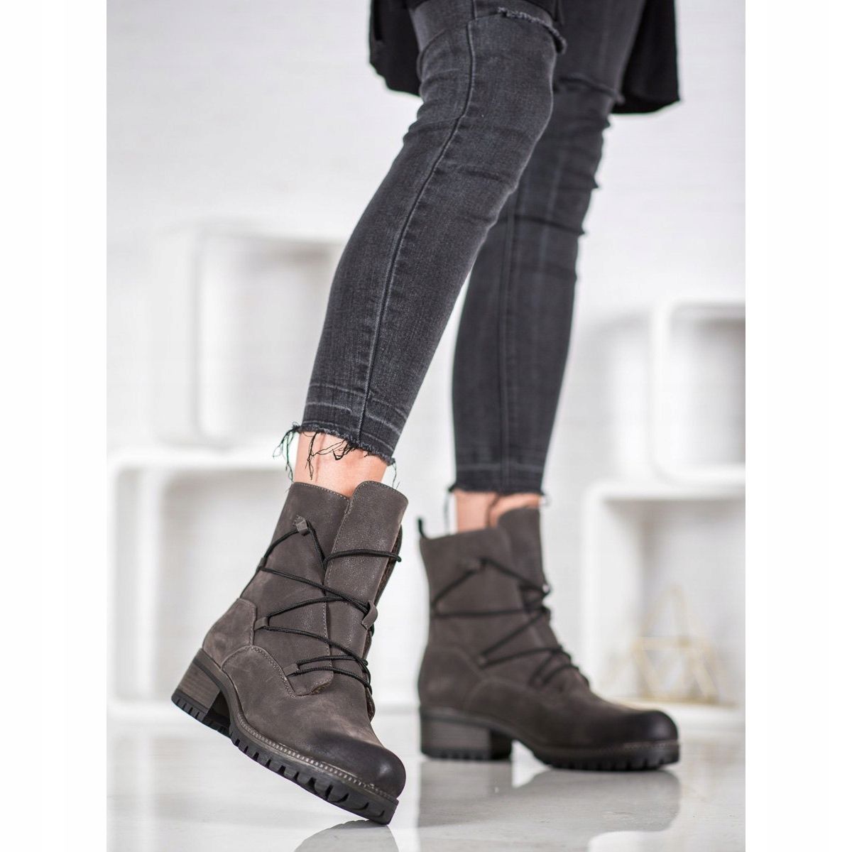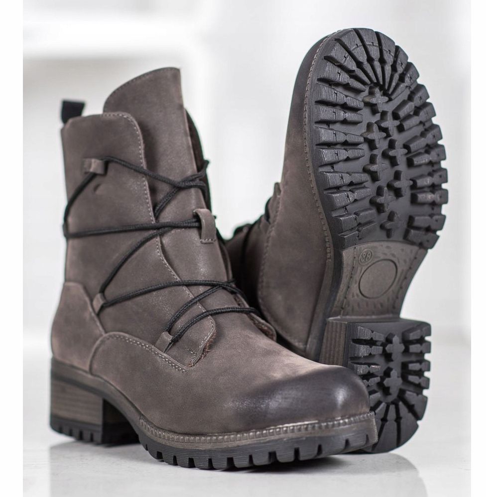 Löydä uusia mahdollisuuksia urheilutyyliin Kylie-brändin harmaalla Workersilla. Nämä muodikkaat naisten nilkkurit eivät ainoastaan tarjoa mukavuutta, vaan myös houkuttelevat ulkonäköä, jotka sopivat täydellisesti kylmempiin päiviin. Laadukkaasta ekologisesta nahasta valmistetut nilkkoja korkeat päälliset on eristetty pehmeällä turkilla, mikä tarkoittaa, että jalkasi ovat aina suojassa kylmältä.