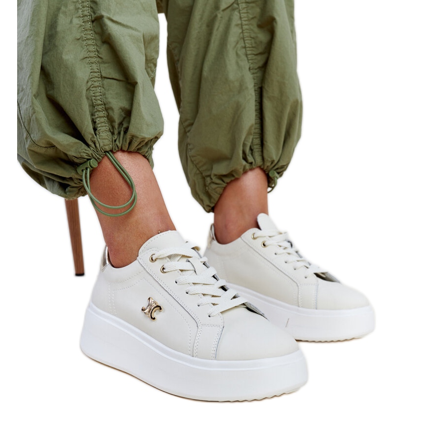 Yksityiskohdat: Vaalean beigenväriset nahkalenkkarit korkealla pohjalla, Melita