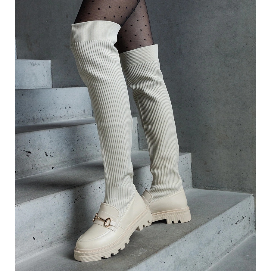Nämä saappaat erottuvat hienovaraisesta vaaleasta beigeväristä, joka sopii täydellisesti erilaisilla tyylillä, sekä päivittäin että erityistilaisuuksiin. Joustava yläosa tarjoaa paitsi täydellisen istuvuuden, myös mukavuuden käyttää koko päivän. Pyöreän varpaiden ja polven korkeuden ansiosta tämä malli lisää eleganssia ja naisellinen tyyli.
