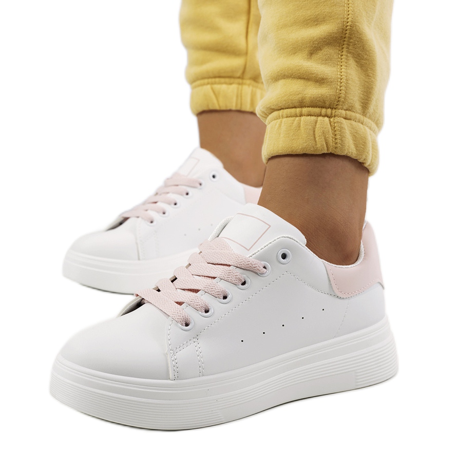 Yksityiskohdat: Vaaleanpunaiset ja valkoiset lenkkarit Justar-alustalla valkoinen vaaleanpunainen