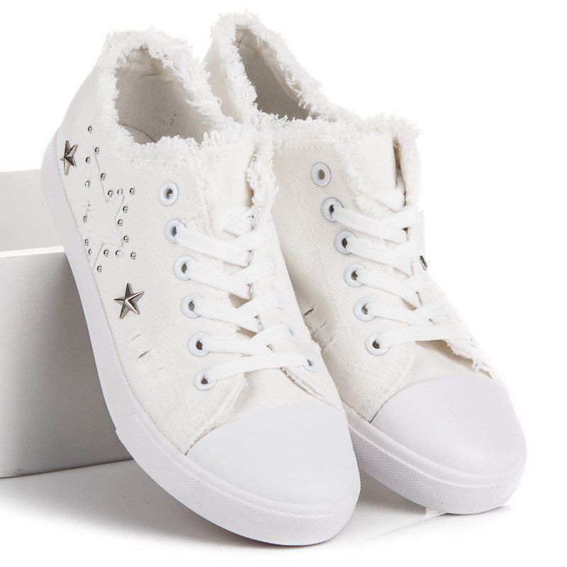 Löydä hienovaraista eleganssia valkoisissa kankaisissa tennareissa, jotka täydentävät täydellisesti mitä tahansa tyyliä. Näille ainutlaatuisille kengille on ominaista luminen sävy ja ainutlaatuinen viimeistely nilkan ympärillä, mikä antaa niille tyttömäisen viehätyksen. Hienojen pisteiden ja tähtien muodossa olevat koristeet tekevät tennareista erottuvia säilyttäen samalla minimalistisen tyylin.
