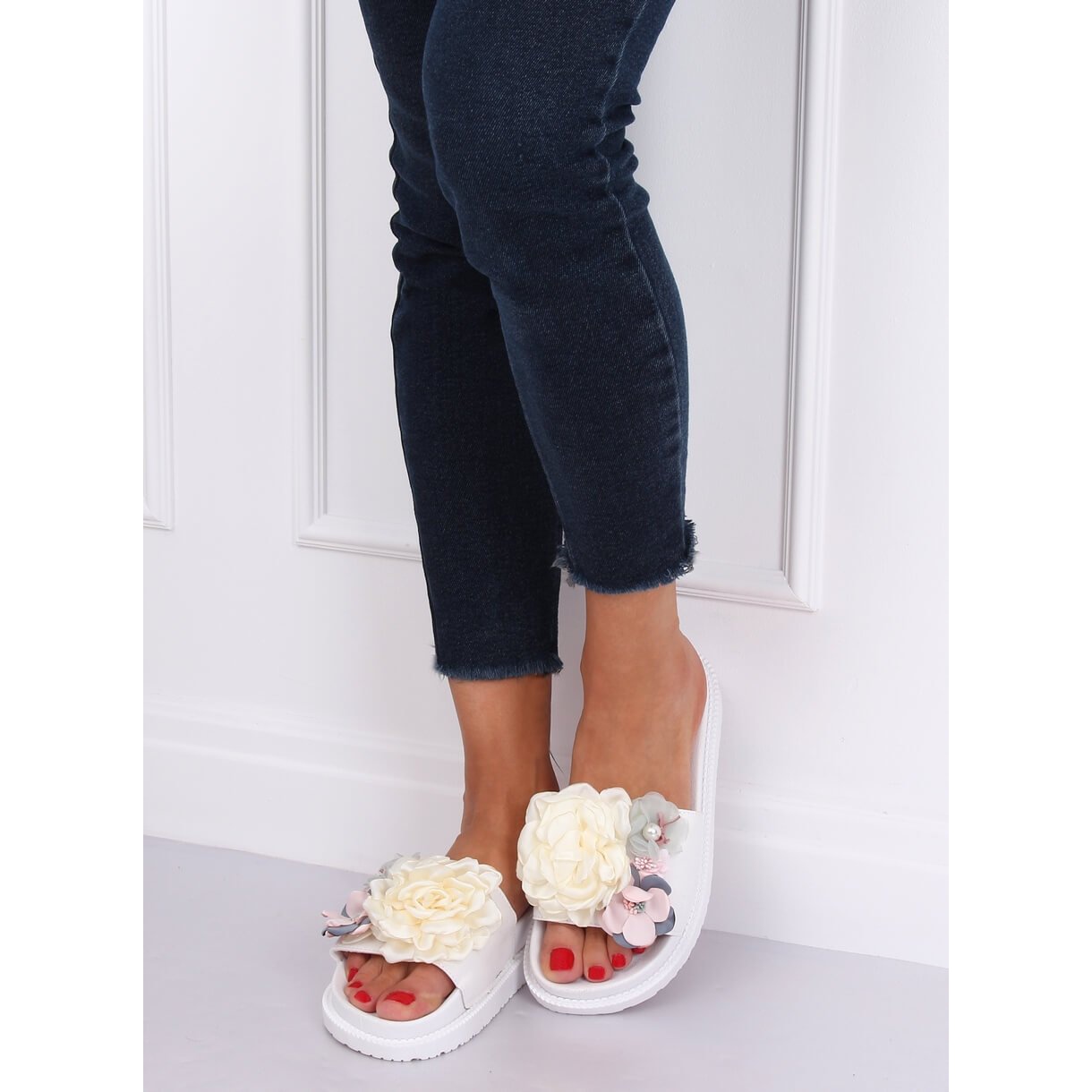PT-109 Valkoiset korkeapohjaiset varvastossut ovat täydellinen valinta naisille, jotka haluavat yhdistää mukavuuden ja romantiikkaa. Nämä viehättävät varvastossut ilahduttavat paitsi yksinkertaisella, myös tyylikkäällä muotoilullaan sekä kauniilla erivärisillä kukilla, jotka antavat niille ainutlaatuisen luonteen.