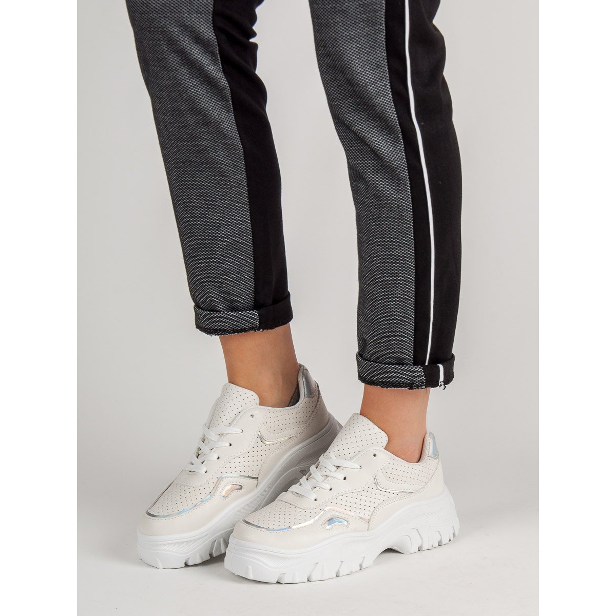 Piristä vaatekaappiasi valkoisilla holo-efektillä varustetuilla tennareilla, jotka vastaavat täydellisesti viimeisimpiä muotitrendejä. Nämä tyylikkäät kengät on luotu naisille, jotka haluavat yhdistää mukavuuden muodikkaan ilmeen. Niissä on paksu 5 cm korkea pohja, joka takaa paitsi tyylikkään myös modernin muotoilun.