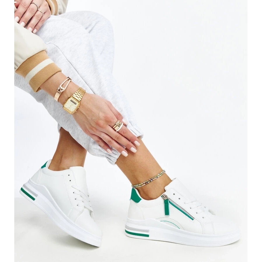 Valkoiset lenkkarit, joissa on vihreä anaunia -insertit D/GMR: ltä, on täydellinen valinta naisille, jotka arvostavat tyyliä ja mukavuutta. Nämä lenkkarit eroavat paitsi muodikkaasta, minimalistisesta suunnittelusta, myös käytettyjen materiaalien korkealaatuista. He sopeutuvat uskollisesti jalkaan, varmistaen mukavuuden käyttää koko päivän.