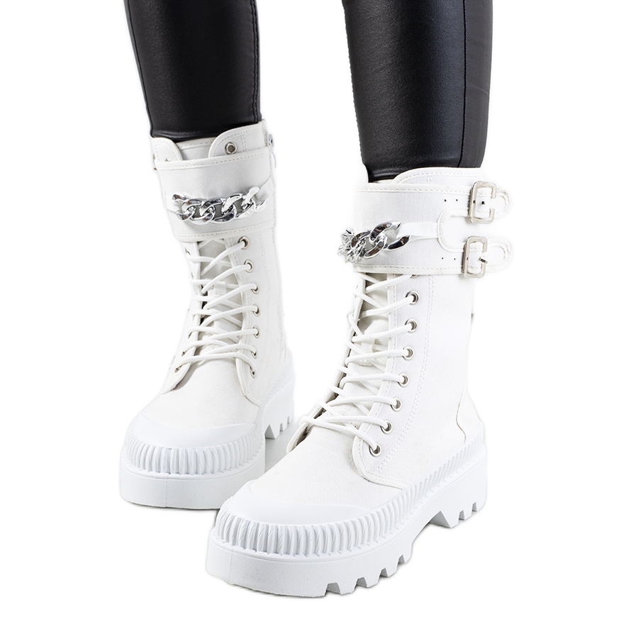 Esittelemme valkoiset lenkkarit ketjulla, malli Taus - erittäin tyylikkäät ja mukavat jalkineet, jotka täydentävät täydellisesti kaikki kesätyylit. Korkea traktoripohja tarjoaa muodikkaan ulkonäön, mutta myös erinomaisen pidon ja mukavuuden käytön aikana.