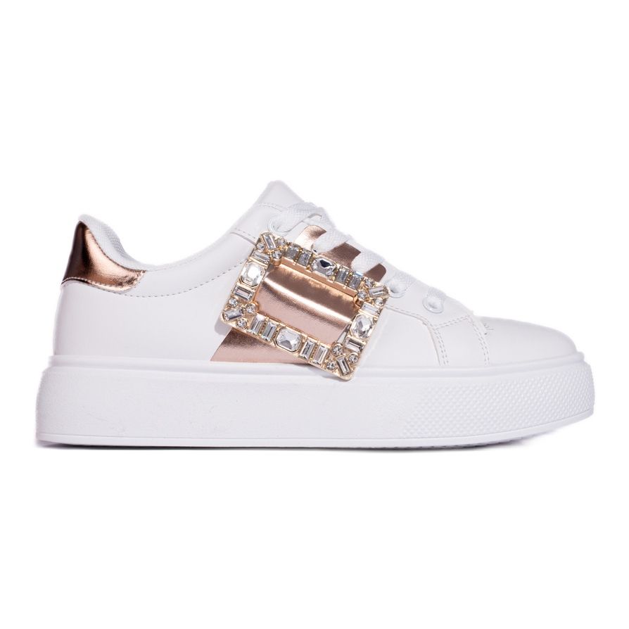Laadukkaasta ekologisesta nahasta valmistetut lenkkarit eivät ole vain elegantin valkoisen värin, vaan myös katseenvangitsija kullanvärisen värin ansiosta. Zirkonien ja strassien muodossa olevat tarvikkeet antavat niille ainutlaatuisen luonteen, joten voit nauttia sekä mukavuudesta että alkuperäisestä ulkonäöstä.