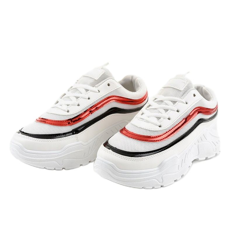 Kengän muotoilu erottuu tyylikkäästä valkoisesta, jota korostetaan silmiinpistävällä punaisella ja mustalla lisäyksellä, mikä antaa niille modernia luonnetta. Pyöreä kärki ja nauhakiinnitys takaavat mukavuuden lisäksi täydellisen istuvuuden jalkaan. Kengän korkeus 10 cm ja 4 cm korkea alusta lisäävät käyttömukavuutta.