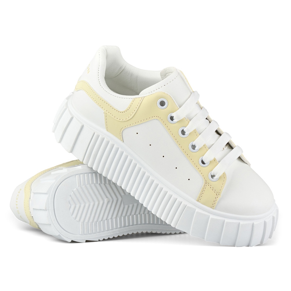 Klassinen, monipuolinen ja muodikkaat - Valkoiset urheilukengät alustalla toisesta tuotemerkistä ovat ehdotus naisille, jotka arvostavat mukavuutta ja tyyliä. Tekologisesta nahasta valmistettu, nauhoituksella ja tekstiiliskansalilla, ne ovat täydellisiä keväällä/kesäkaudella jokapäiväisen kaupunkien tyylin perustana.
